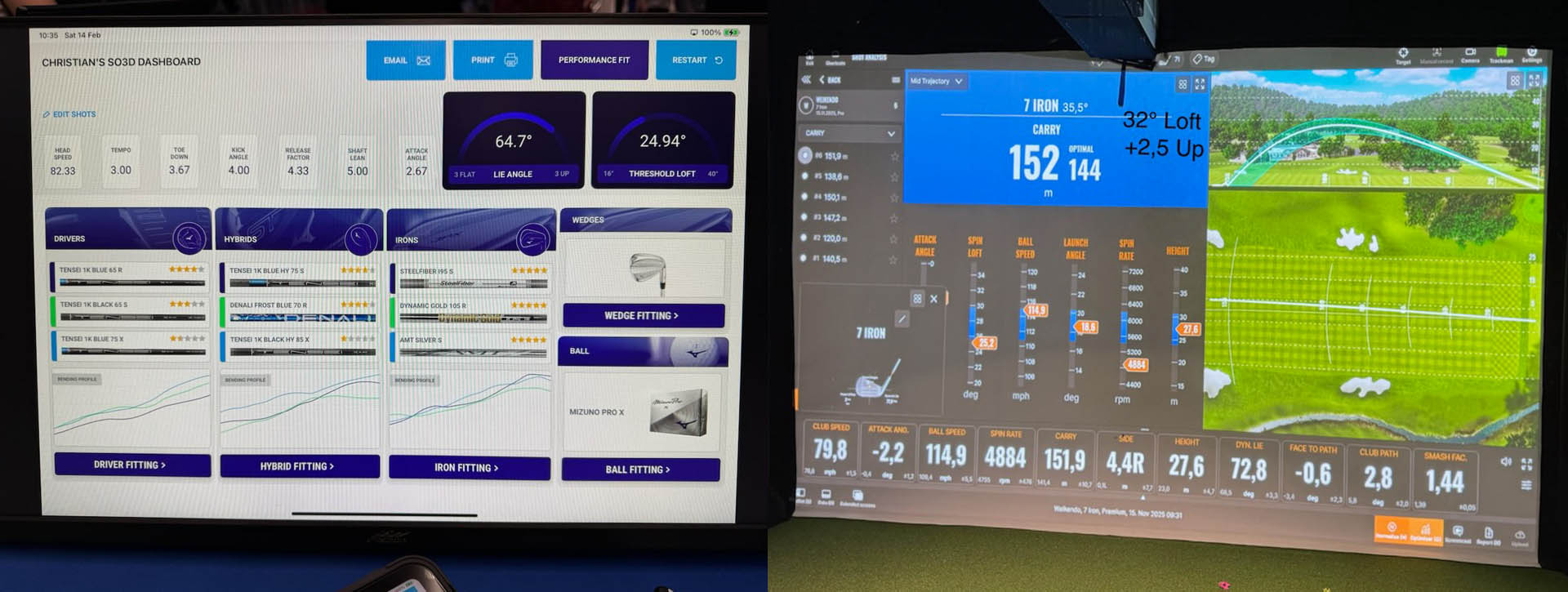 Dann kam der Datensatz-Hagel: TrackMan hier, Mizuno Shaft Optimizer da, Launch-Winkel, Spinrate, Attack Angle, Lie-Winkel. Kurz gesagt: genug Zahlen, um einen Satelliten zu steuern – oder einen 7er-Iron auf 145 Meter zu schicken, falls der Wind gnädig ist.